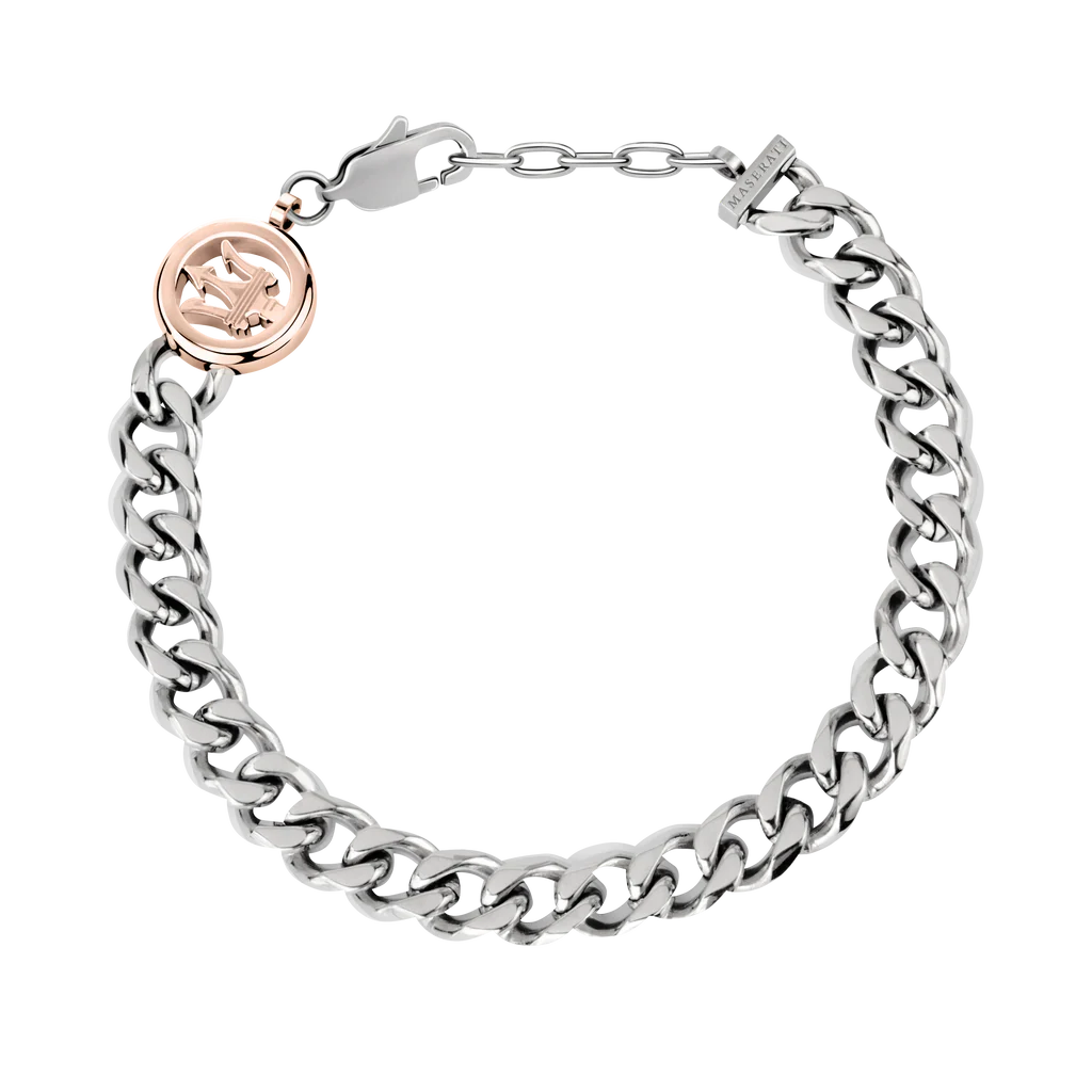 Bracciale Maserati in Acciaio da Uomo JM418ANI02. Bracciale in acciaio inossidabile. Logo Maserati in acciaio rosa lucido. Chiusura con moschettone. Lunghezza 19 cm. Rif. JM418ANI02