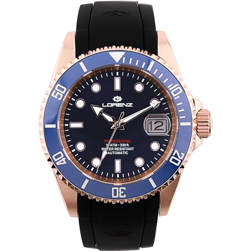 Orologio da uomo solo tempo, cassa rotonda in acciaio 316L placcata oro rosa, diametro 42 mm., lunetta in ceramica blu, vetro zaffiro con lente, fondo a vite con logo della tartaruga. Cinturino in resina doppia iniezione, movimento automatico Seiko NH35, resistente all’acqua fino a 10 atmosfere.